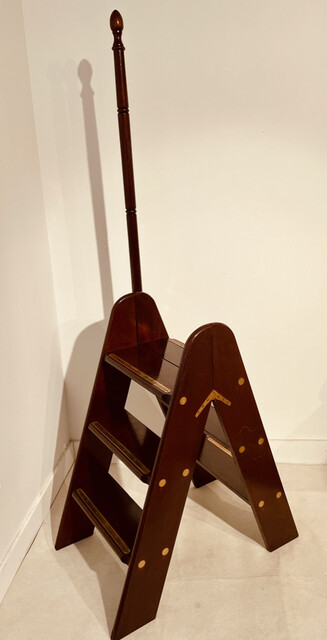 An English 19th Century Mahogany Double Library Step having a tall Hand Support Pole.