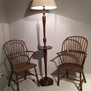 A Rare English Antique Oak Lamp Stand having a Wine Tasting Table. Two 18th Century Windsor Chairs.